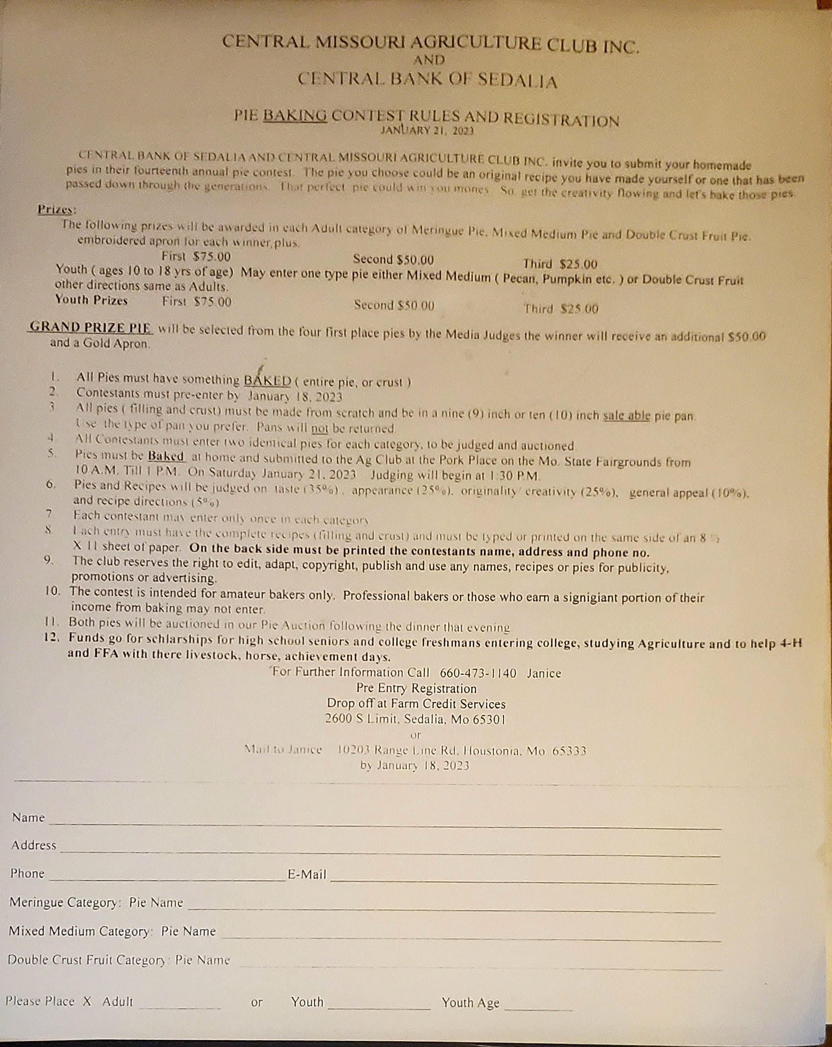 CENTRAL BANK and the CENTRAL MISSOURI AGRICULTURE CLUB INC. invite you to submit your homemade pies in their 14th annual pie contest. The pie you choose could be an original recipe you have made yourself or one that has been passed down through the generations. That perfect pie could win you money. So, get the creativity flowing and let’s bake those pies.